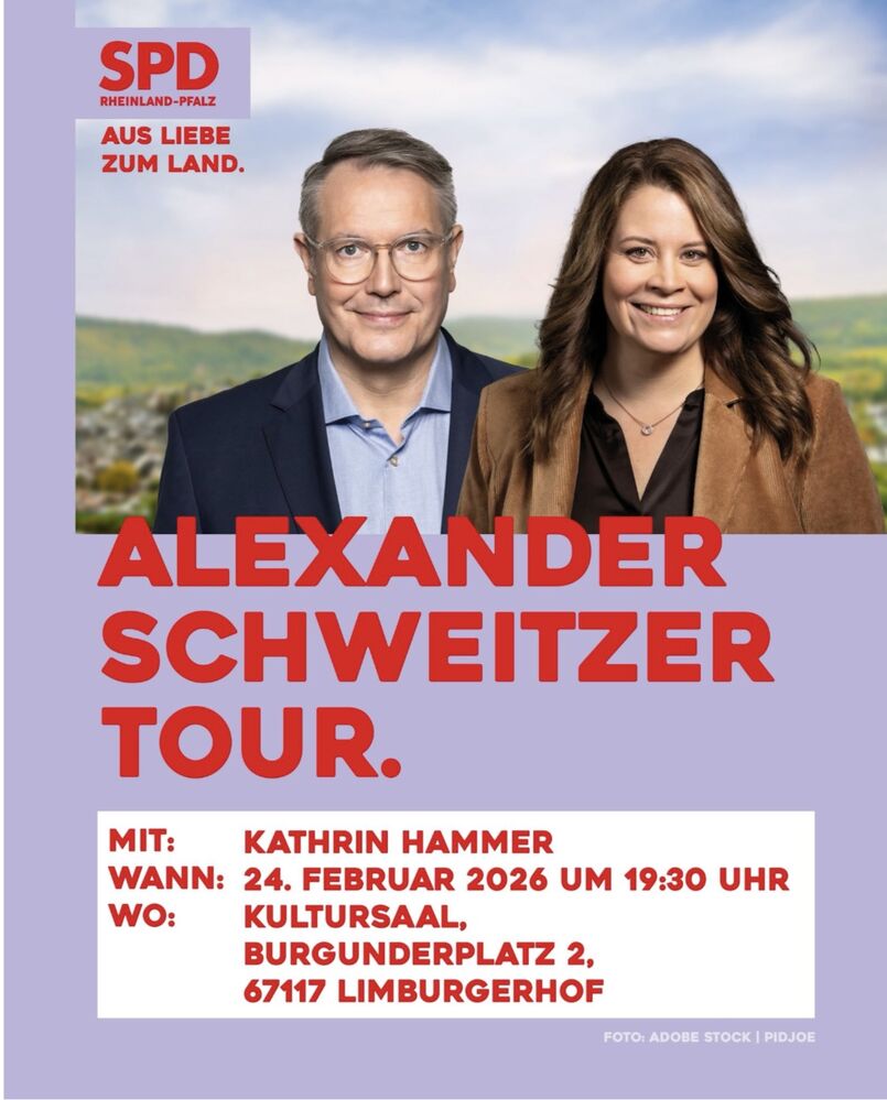 Gemeinsam mit Kathrin Hammer spricht er über seine Ideen für die Zukunft des Landes und will mit den Bürgerinnen und Bürgern ins Gespräch kommen und zuhören. „Ich freue mich sehr, dass wir Alexander Schweitzer im Kultursaal in Limburgerhof begrüßen können. Dass er mit seiner Tour in unserer Region Halt macht, ist ein starkes Zeichen für unseren Wahlkreis. Es zeigt, dass die Anliegen der Menschen hier vor Ort auf Landesebene gehört und ernst genommen werden.“, sagt Kathrin Hammer, Landtagskandidatin im Wahlkreis 38 Mutterstadt.